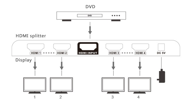 CLR-HDMI-S214 is the HDMI splitter which distributes 1 way HDMI signal from STB,DVD Blu-ray players or PS3 etc. to 4 ways identical HDMI signals to connect to projector, LCD or other HD displays simultaneously.